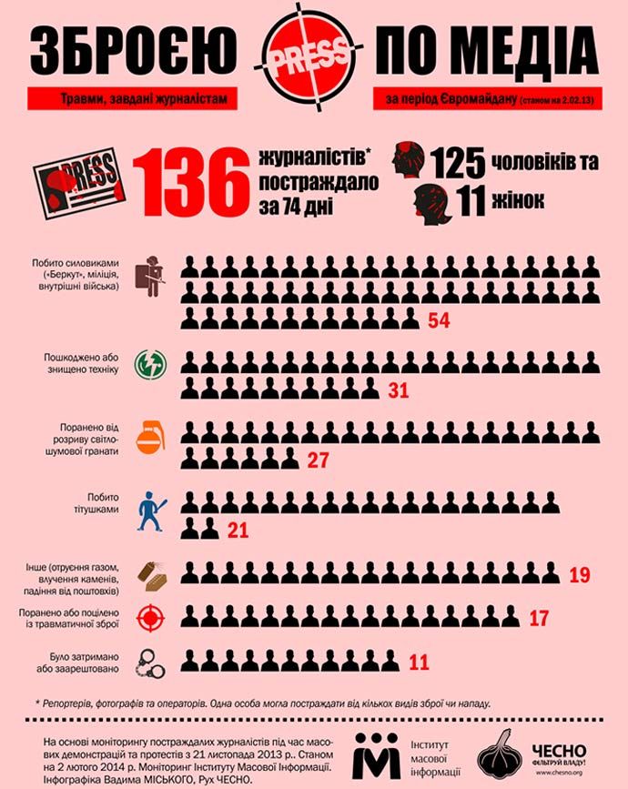 В Україні від початку масових протестів, які розпочалися з 21 листопада 2013 року, постраждали 136 журналістів. Такі дані оприлюднив Інституту масової інформації (ІМІ), який відслідковує, фіксує та перевіряє інформацію про постраждалих журналістів, фотографів та операторів під час виконання ними професійних обов’язків у зоні сутичок протестувальників, міліції та «тітушок» у Києві та інших містах.