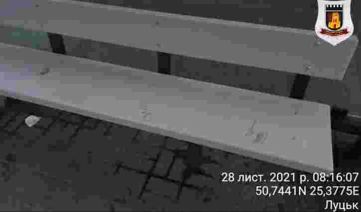 Як повідомили у прес-службі департаменту муніципальної варти, інцидент стався у середу, 24 листопада, на зупинці біля готелю «Україна», що на вулиці Словацького у Луцьку. Камера відеоспостереження зафіксувала, як юнак наніс написи на лавку. Муніципали закликали допомогти встановити його особу.