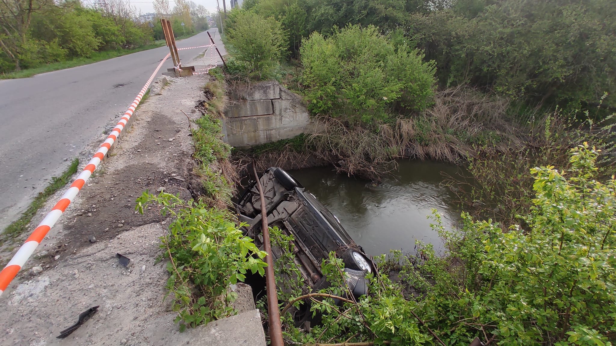 У суботу, 13 квітня, на дорозі поблизу міста Пустомити на Львівщині водій Renault Megane злетів з моста в річку, де автомобіль перекинувся на дах.