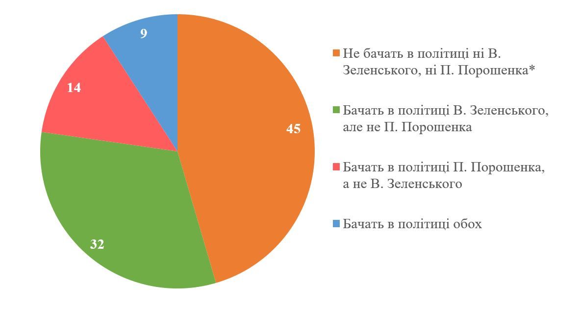 «Загалом 45% респондентів не бачать в політиці після війни ні Зеленського, ні Порошенка. Ще 46% бачать у політиці когось одного, але не хотіли б, щоб у політиці лишався другий. Причому більше тих, хто хотів би, щоб лишався Зеленський. Так, 32% вважають, що в політиці має залишитися Зеленський, але Порошенко. Навпаки хотіли б 14%. І лише 9% відповіли, що хотіли б, щоб в політиці залишилися Зеленський та Порошенко», – зазначили соціологи.
