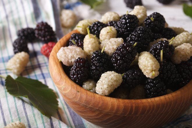Пів склянки шовковиці містить 1,3 мг заліза. Цей природно солодкий фрукт не містить багато цукру, але містить багато антиоксидантів та рослинних сполук, таких як антоціани, які допоможуть боротися із запаленням. Із шовковиці готують варення, додають до мафінів або смакують її окремо.