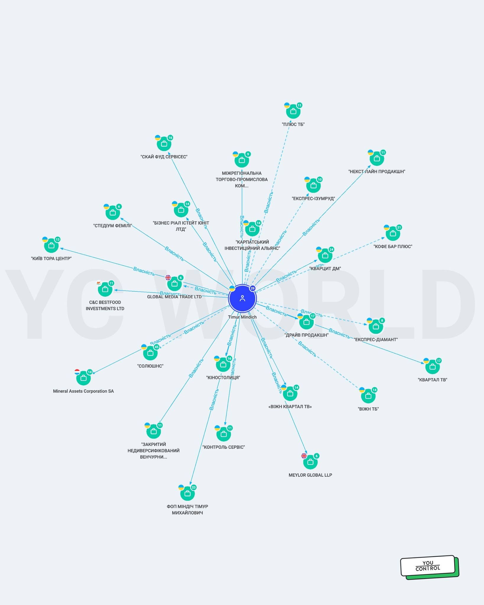 YouControl проаналізував та опублікував у четвер, 13 листопада, відкриті дані щодо Тимура Міндіча та Олександра Цукермана. Аналітики зазначили, що Міндіч пов'язаний із 17 юридичними особами в Україні.