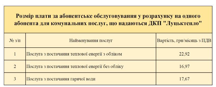 На сайті «Луцьктепла» йдеться, що граничний розмір абонплати, відповідно до чинного законодавства, станом на 1 жовтня 2024 року становить 42,9 грн. Зазвичай, їх дві: постачання тепла та гарячої води. Для луцьких споживачів, в яких є побудинковий облік тепла, ця сума становить майже 40,6 грн.