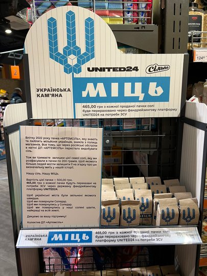 Держпідприємство «Артемсіль» спільно з платформою United24 випустило лімітовану серію солі «Міць. Українська кам'яна» для збору на дрони-камікадзе для головного управління розвідки. Весь прибуток з кожної пачки йде на покупку військового обладнання. На збір «Артемсіль» віддало останню партію солі – через російські обстріли завод було знищено, а повністю з полиць артемівська сіль зникла влітку 2022-го.