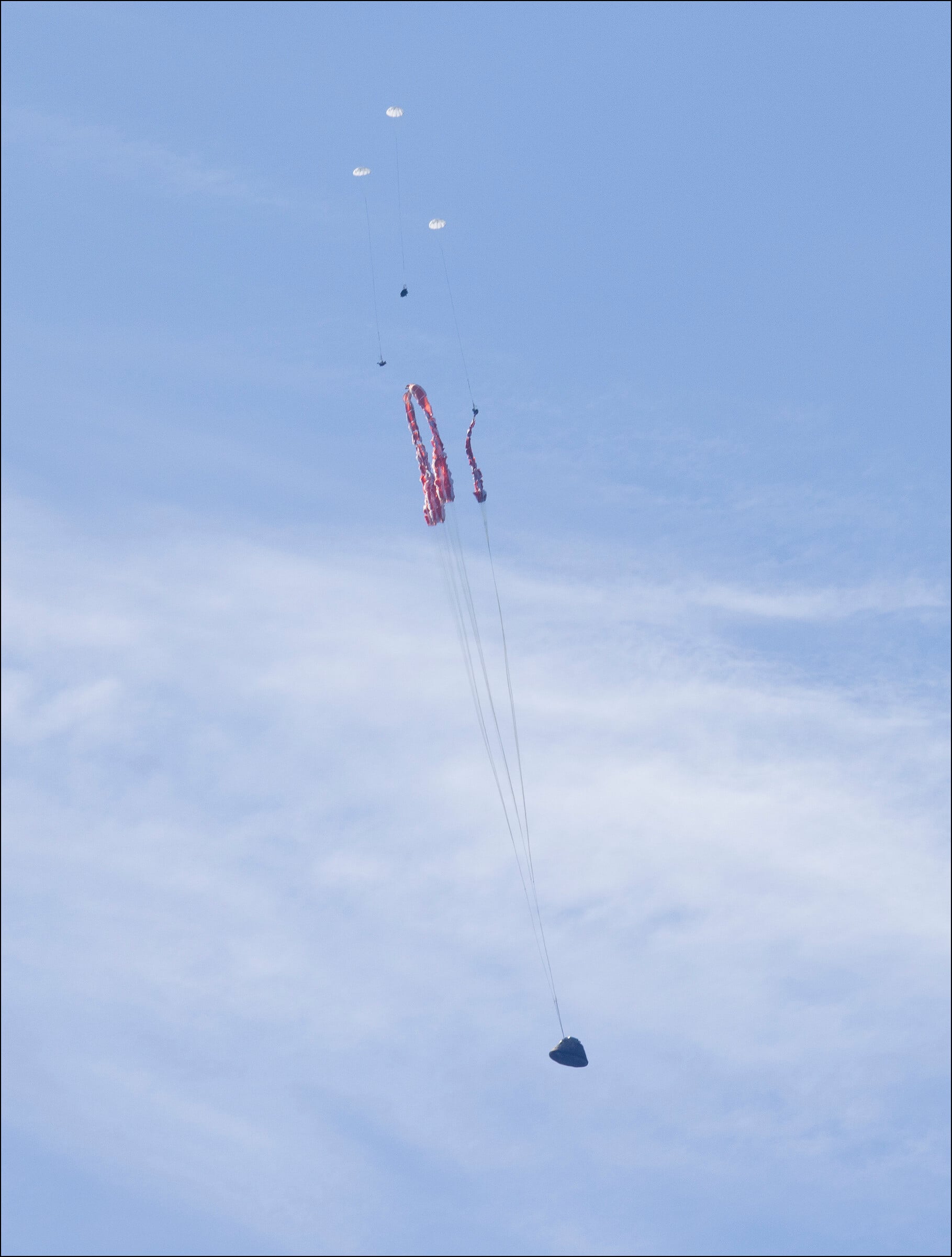 Капсула увійшла в атмосферу Землі зі швидкістю понад 40 тис. км/год. 11 її вбудованих парашутів сповільнили її до близько 32 км/год.