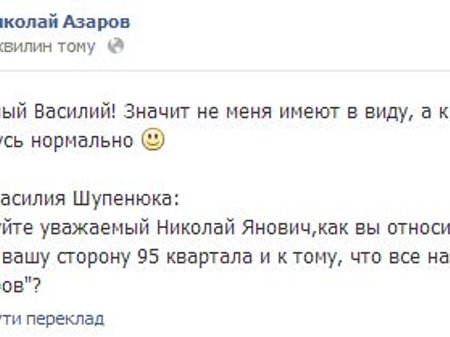 Про це він заявив на своїй сторінці в мережі Facebook, відповідаючи на запитання користувача про те, як він ставиться до гумору на свою адресу з боку 95 кварталу і до того, що всі називають його "Азiров".