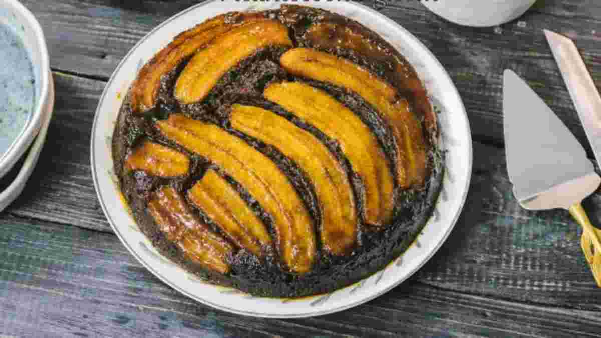 В окремій мисці змішайте всі сухі інгредієнти. Додайте їх до вологої частини і добре вимішайте. Накрийте тістом банани у сковорідці, розподіляючи його лопаткою так, щоб банани були вкриті тістом повністю. Поставте пиріг до розігрітої до 180 градусів духовки і випікайте 35-40 хвилин, доки зубочистка, встромлена по центру пирога, буде виходити сухою. Дістаньте пиріг з духовки і залишити на 10 хвилин в сковорідці. Після цього обережно відділіть ножем тісто від країв сковорідки. Накрийте сковорідку великою тарілкою і переверніть. За потреби, постукайте по дну сковорідки, щоб пиріг випав.