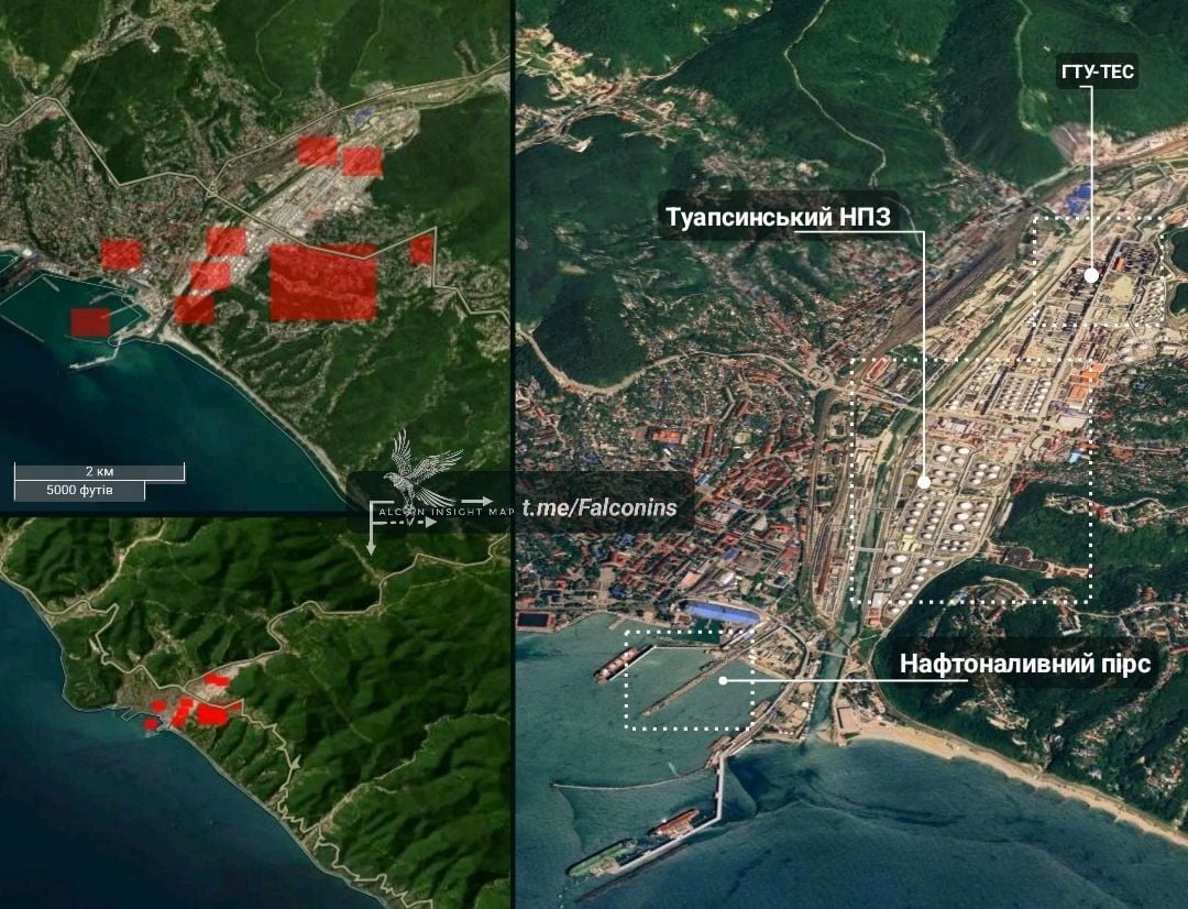 «За даними супутникового моніторингу пожеж зафіксовано термальні аномалії в районах нафтоналивного пірса, резервуарного парку для нафти та нафтопродуктів, ГТУ-ТЕС Туапсинського НПЗ, що свідчить про успішну атаку Сил обробки України», – повідомив OSINT-проєкт Falcon insight map.