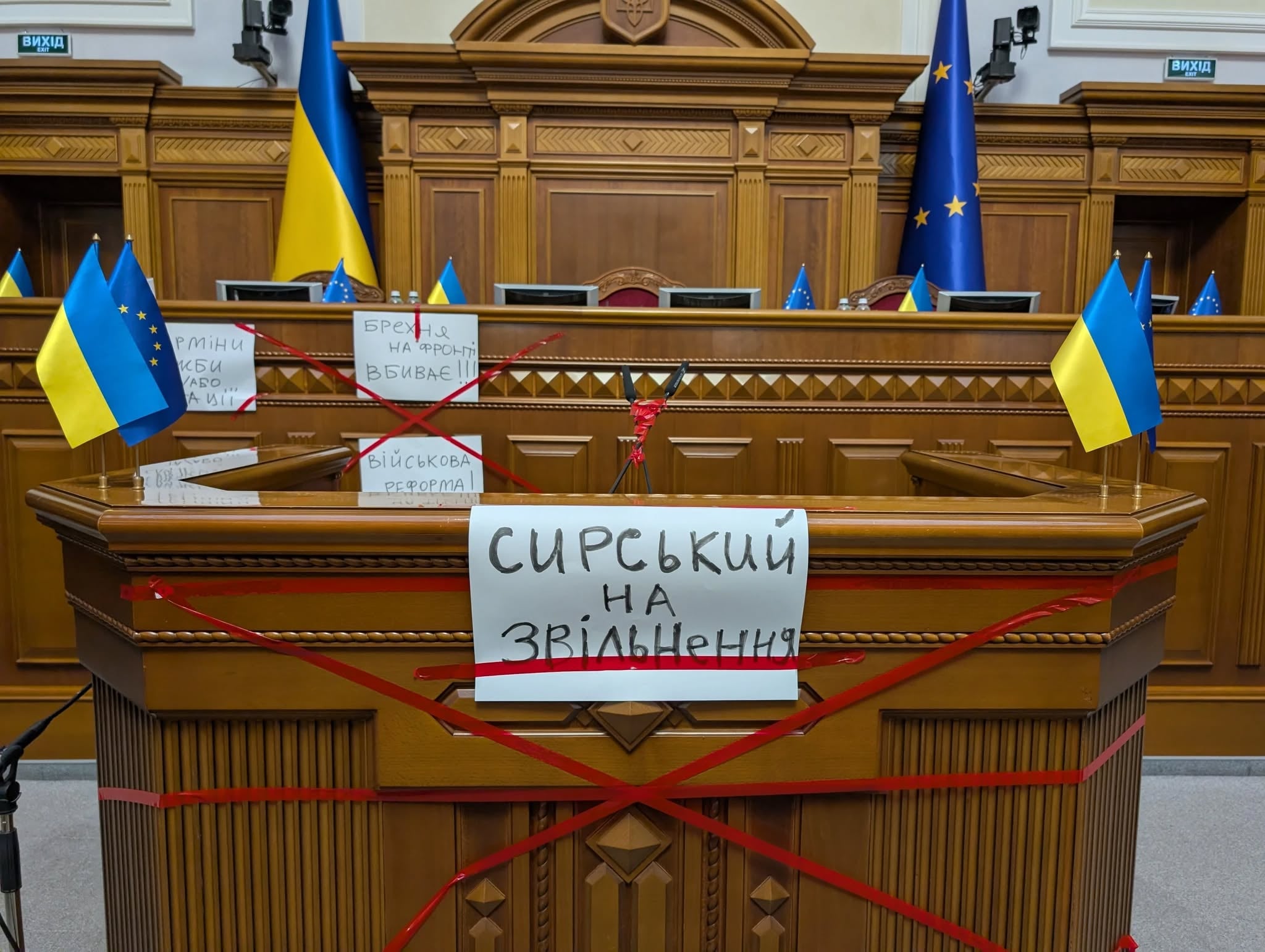 Позафракційна депутатка Мар’яна Безугла прийшла на засідання Верховної Ради з червоним скотчем та плакатами, на яких були написані гасла, що закликають до звільнення Олександра Сирського з посади Головнокомандувача ЗСУ. Безугла прикріпила плакати до трибуни ВР й обмотала скотчем мікрофони.