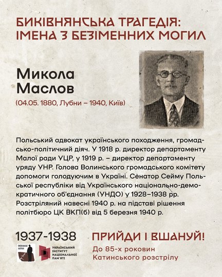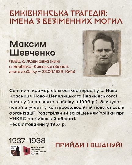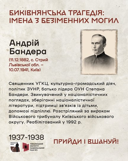 018 травня в Україні вшановують пам’ять жертв політичних репресій. Тоталітарна радянська влада залишила в Україні безліч безіменних могил, приховуючи жорстокі злочини і несправедливі вироки. Одним з масштабних місць захоронень став Биківнянський ліс на схід від Києва. Там на площі 5,3 гектара поховали щонайменше 30 тисяч вбитих і закатованих у київських тюрмах політичних вʼязнів. Втім, серед жертв були не лише жителі столиці. Нині відома лише частина імен – представники духовенства, селяни, робітники фабрик, дрібні клерки, інтелігенція з різних регіонів, українці, євреї, поляки – всі, хто випадково потрапив в лещата каральної системи. Серед них і батько Степана Бандери, греко-католицький священник отець Андрій.
