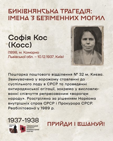 «Науковці дійшли консенсусу, що у 1937-38 роках усіх розстріляних у київських тюрмах ховали в Биківні. Інших місць для цього не було. Власне, цю спецділянку й виділили після того, як Лукʼянівське кладовище було переповнене», – зазначає історикиня.