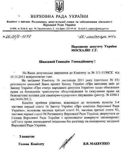 Комітет із питань регламенту, депутатської етики та забезпечення діяльності Верховної Ради України відмовився передавати на розгляд в парламент законопроект нардепа Геннадія Москаля № 8300-1 від 14.04.2011р., у якому пропонується скасувати пільги для народних депутатів.