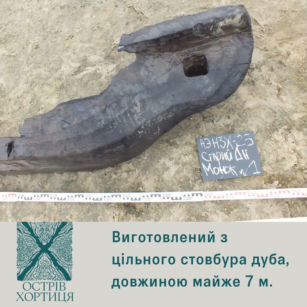 «Довбаний човен, виготовлений з цільного стовбура дуба, довжиною майже 7 м. В минулому біля берегів Хортиці заходили подібні човни, які пов’язані з давньоруським поселенням на острові. Воно існувало з X по XIV cт. Такі плавзасоби використовувалися для риболовлі та інших промислів, місцевих перевезень, а також для обслуговування переправ. Можливо, і нова знахідка з тієї ж епохи. Згідно зі станом збереженості деревини можна припустити, що вік човна може сягати 500 років. Але більш точне датування стане можливе після проведення радіовуглецевого аналізу», – повідомили у національному заповіднику «Хортиця».