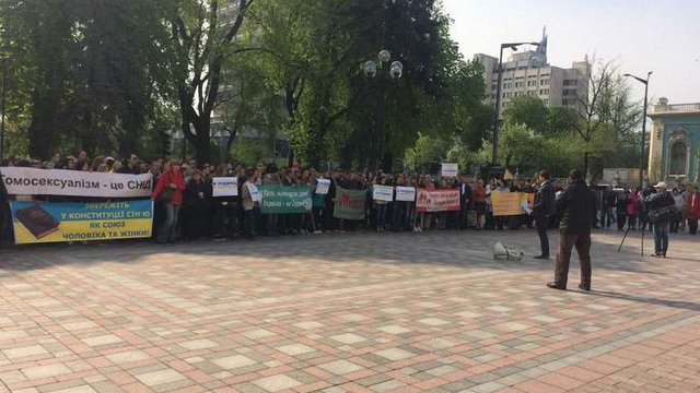 20 квітня приблизно 300 активістів біля будівлі Верховної Ради України протестують проти легалізації одностатевих шлюбів, яку, на думку активістів, можуть підтримати парламентарі вже за кілька років внаслідок реалізації раніше прийнятої урядом «Національної стратегії у сфері прав людини на період до 2020 року», повідомляє РБК-Україна.