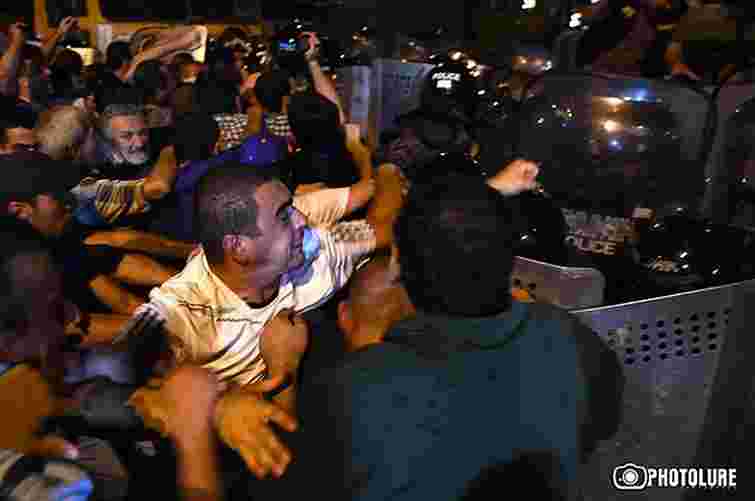В Єревані біля захопленої будівлі МВС почалися сутички між мітингувальниками і поліцейськими. Правоохоронці застосувала шумові гранати, щоб розігнати мітинг. У відповідь мітингувальники закидали поліцейських камінням, повідомляє агентство «Новини-Вірменія».