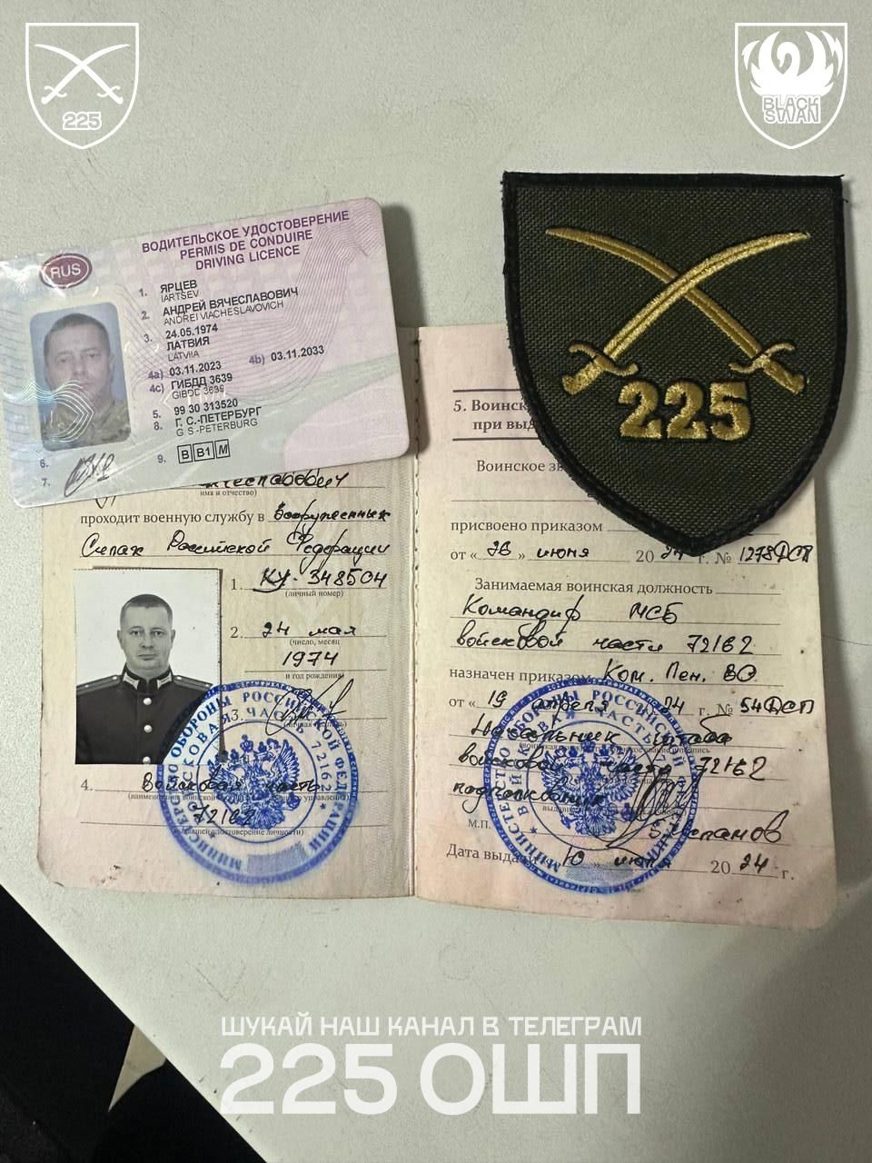 Бійці 225 ОШП опублікували документи російського комбата. Судячи з запису у його військовому квитку, йому було 51 рік. Він народився 24 травня 1974 року та проживав у Санкт-Петербурзі. Ліквідований Ярцев мав звання майора.
