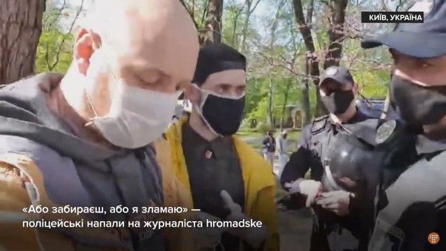 Правоохоронці продовжували наполягати на своєму, а один з них сказав: «або забираєш (камеру), або я зламаю». Відтак поліцейські напали на журналістів в прямому ефірі та зламали стабілізатор камери.