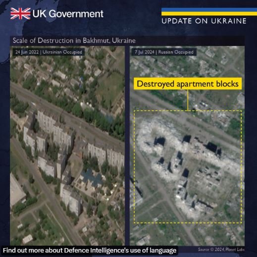 Британська розвідка показала супутникові знімки масштабів руйнувань у Бахмуті Донецької області, який був зруйнований під час боїв між Силами оборони та російськими окупантами. Про це йдеться у новому зведенні міноборони Великої Британії.