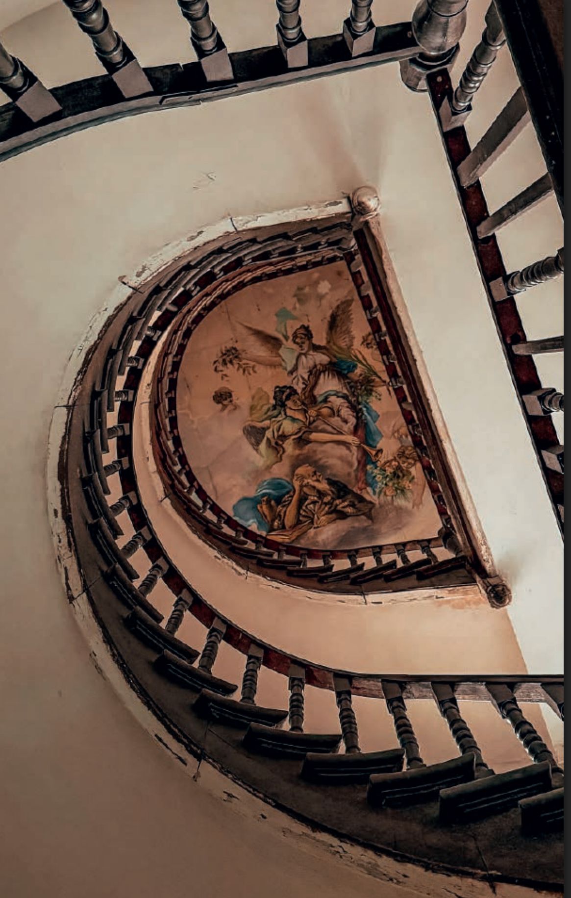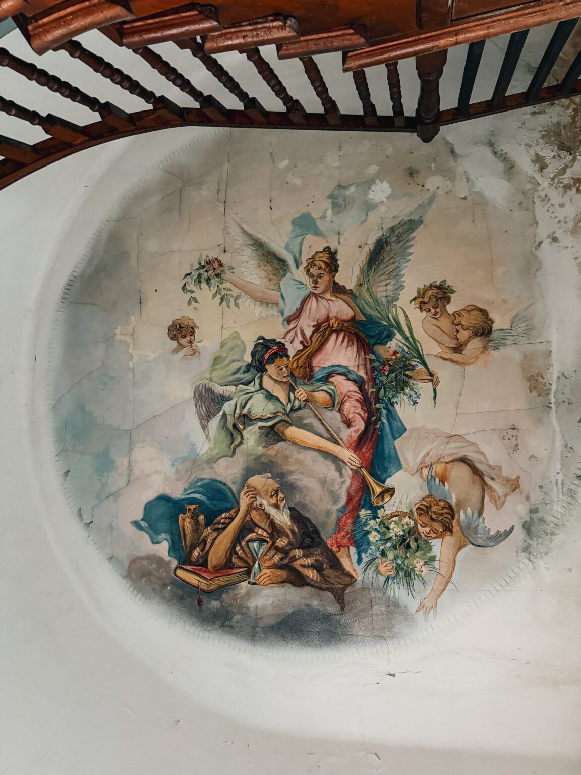Особливим є коридор з підковоподібною деревʼяною сходовою кліткою. Над нею на рівні третього поверху донині зберігся розпис плафона. Там зображений Святий Єронім із книгою та пісочним годинником у руках, який слухає сурми ангела, що сповіщає про Страшний суд. Позаду нього сидить сова, ангели-херувими довкола тримають квітучі зелені гілки та кошик із квітами.