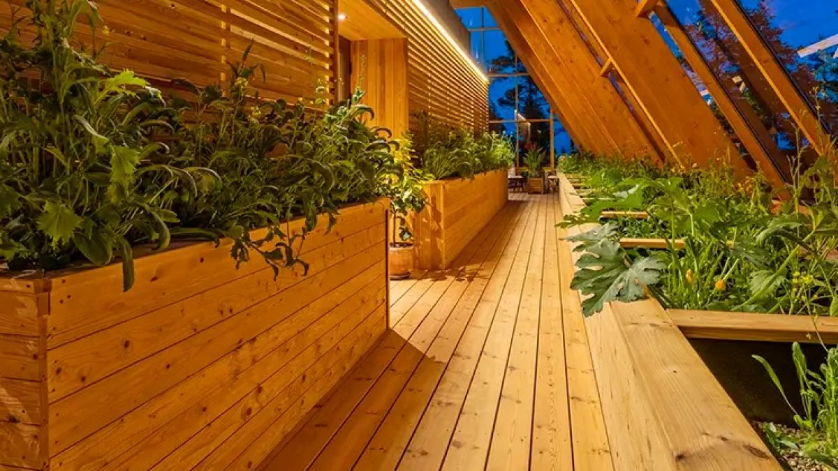 Фасад та дах теплиці виготовлені зі скла та інтегровані з фотоелектричними елементами, забезпечуючи ефективне виробництво енергії. Усередині теплиці будинок має дерев’яну обшивку, а каркас та підлога виготовлені з дерев’яної конструкції, ізольованої деревним волокном, що забезпечує чудові теплові характеристики.