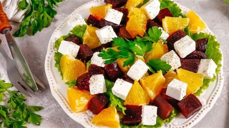 Розігрійте духовку до 200°C. Буряк вимийте, загорніть у фольгу, запікайте 40–60 хв до м’якості. Охолодіть, очистьте, наріжте кубиком. З’єднайте буряк, філе апельсина, руколу та горіхи. Заправте олією, лимонним соком, посоліть, поперчіть; зверху – крем-сир.