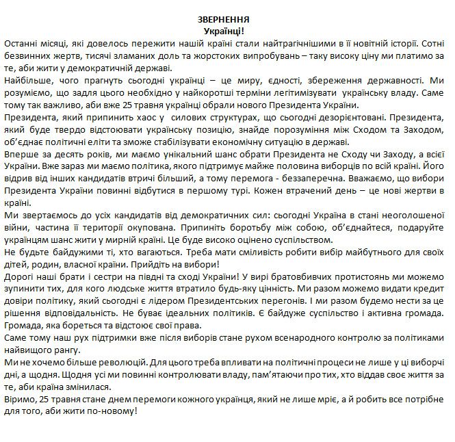 Представники інтелігенції Львова вирішили об’єднатися заради того, щоб обрати президента у першому турі виборів. 13 травня вони звернулися до громади із проханням підтримати кандидата в президенти, який має найбільший рейтинг. Проукраїнських кандидатів з низьким рейтингом просять зійти з дистанції.