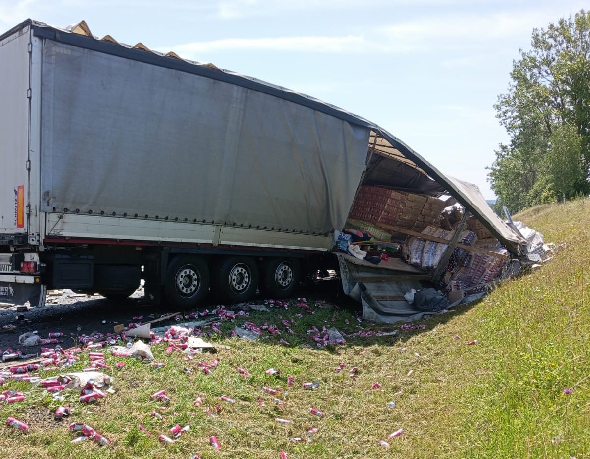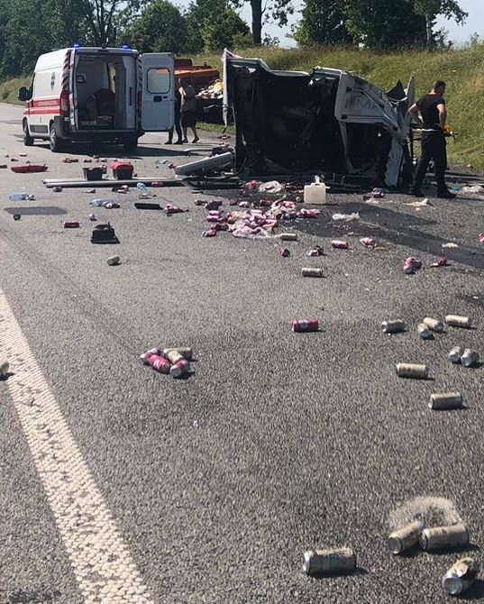 Як видно з оприлюднених поліцією фото, у результаті ДТП в одної фури відірвалася кабіна та пошкодився кузов, на трасу висипався товар – алюмінієві бляшанки з квасом та пивом.