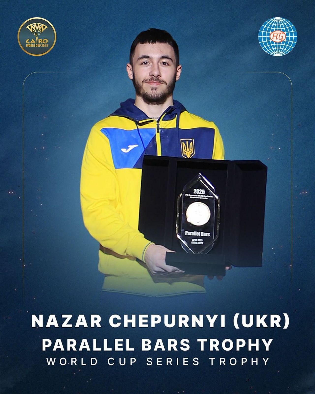 Український гімнаст Назар Чепурний став переможцем заліку Кубка світу на паралельних брусах, повідомляє НОК України. Це відбулося за підсумками останнього етапу, який пройшов у єгипетському Каїрі. Завдяки стабільним виступам протягом усього змагального сезону, спортсмен впевнено виборов перше місце в загальному заліку.