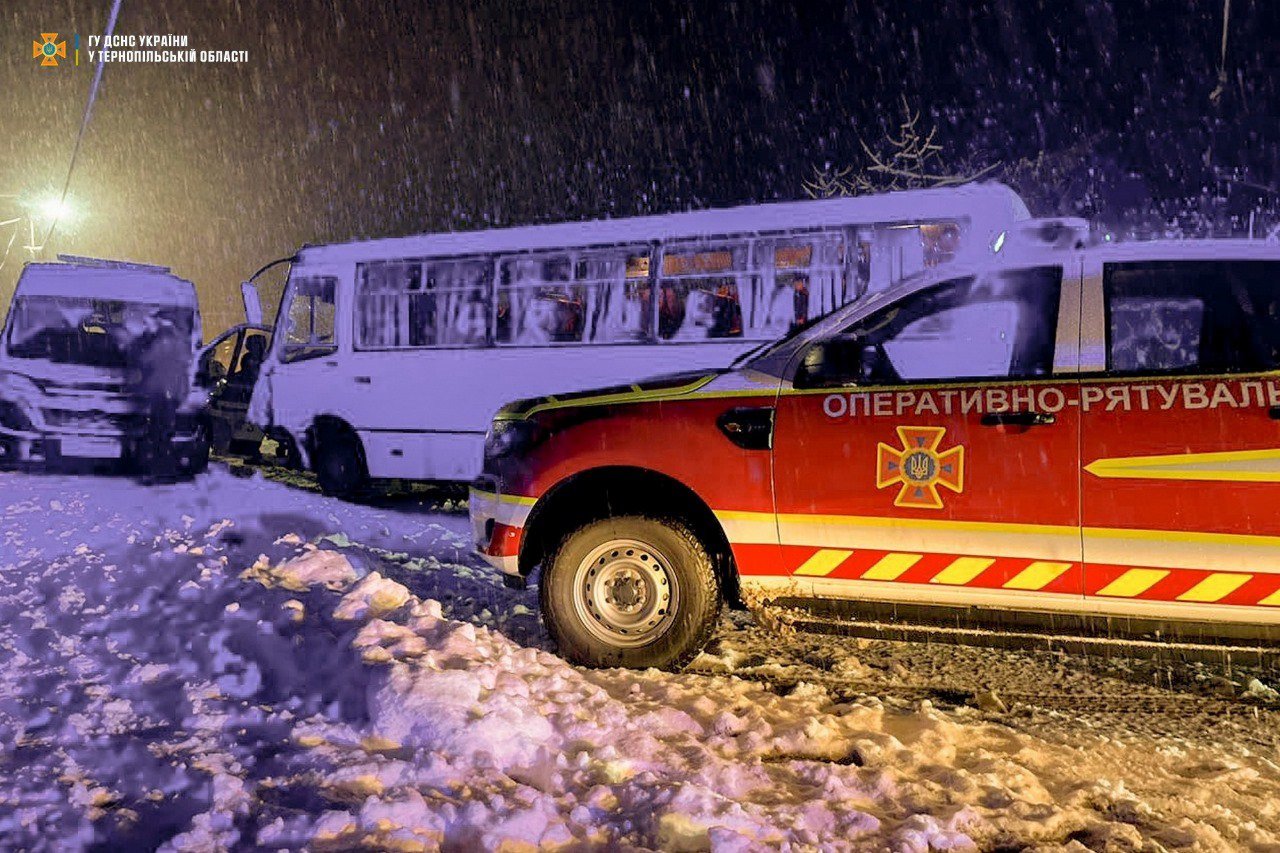 У прес-службі ДСНС повідомили, що через снігопад сталося ДТП за участі автомобіля «швидкої допомоги» та автобуса Isuzu. У транспорті перебувало 14 людей, постраждала тільки фельдшерка «швидкої», яку деблокували рятувальники. Зіткнення відбулося у селі Підзамочок Чортківського району.