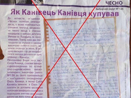 На Львівщині зафіксовано черговий факт розповсюдження інформаційної листівки нібито від громадської ініціативи «Чесно», що містить начебто лист від Сергія Канівця (самовисуванця) до Олега Канівця (кандидата від «Батьківщини»). Листівки було поширено у виборчому окрузі № 126, де балотуються дані кандидати.