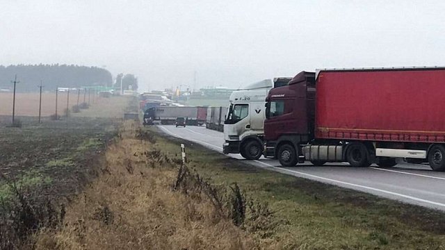 У прес-службі поліції також додали, що частина авто їде по узбіччі, об'їжджаючи перекриту трасу. Станом на 15:20 вантажівки розблокували трасу до кордону.