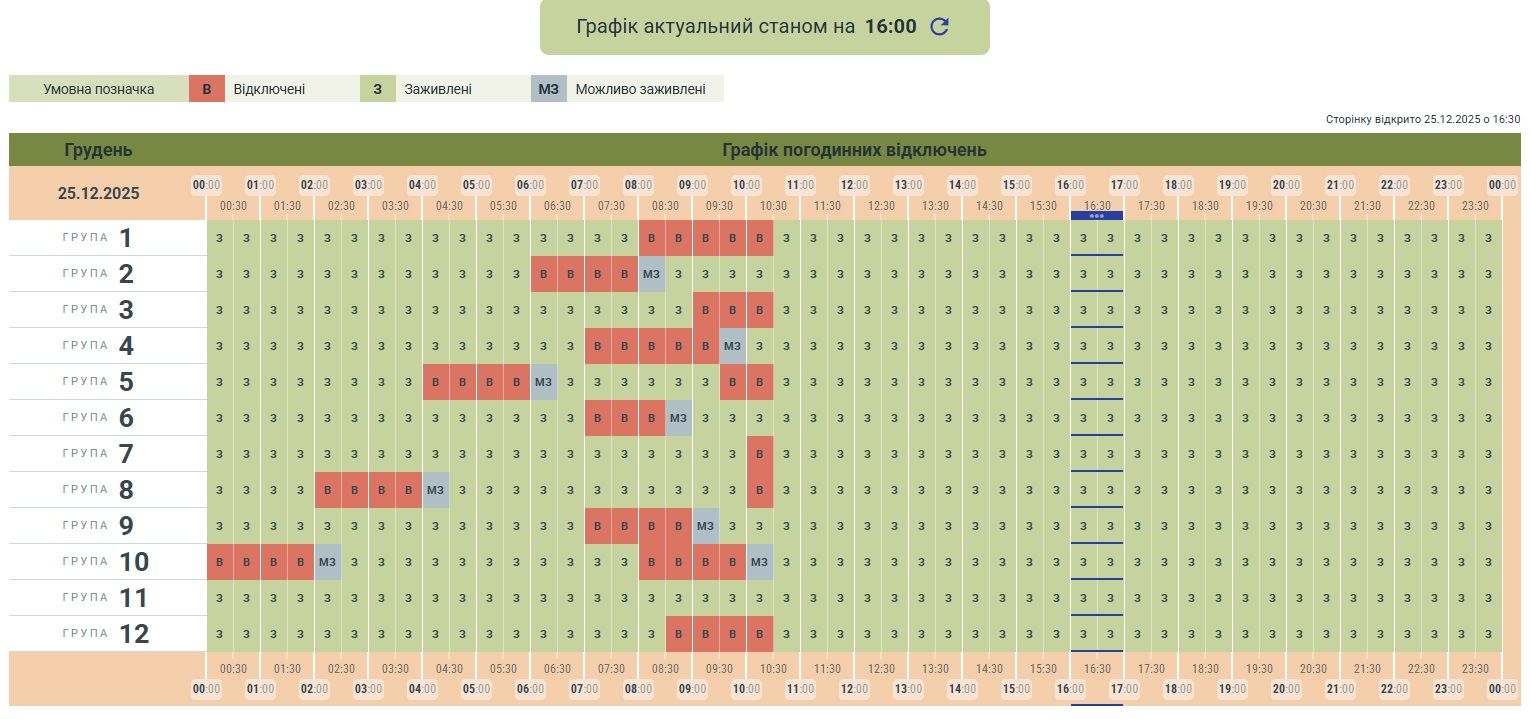 Актуальний графік відключень на 25 грудня