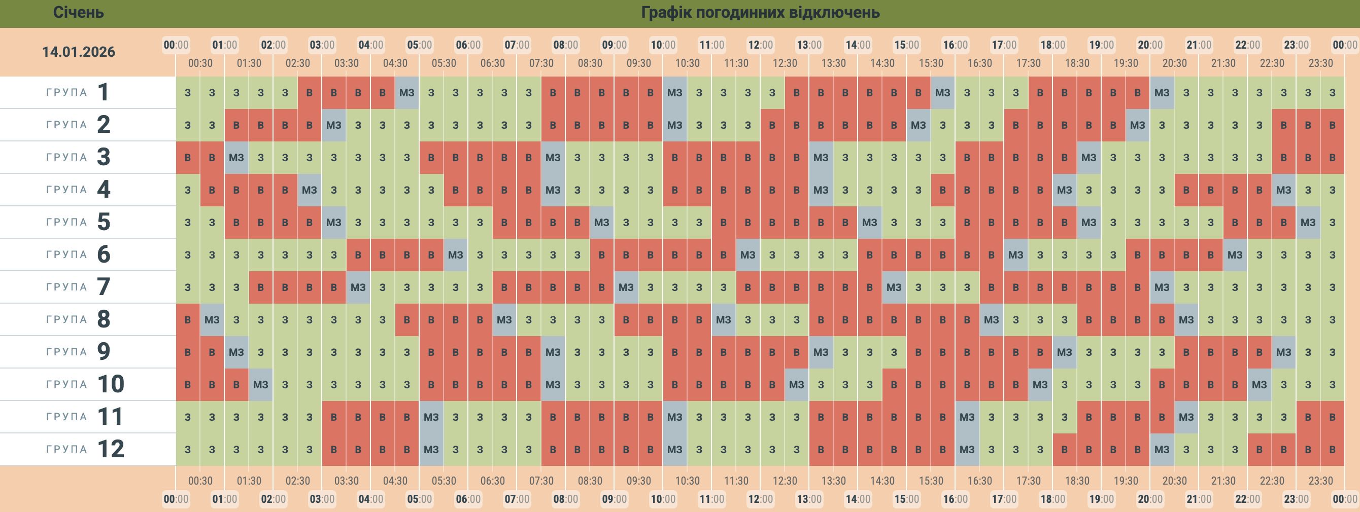 У графіку зеленим відображаються години, коли споживачі матимуть електроенергію, а червоним – години знеструмлення. Сірі клітинки вказують годину, коли група може бути заживлена, залежно від змін у лімітах чи обсягів споживання енергії. Графік може змінюватися залежно від оперативної ситуації в енергосистемі країни.