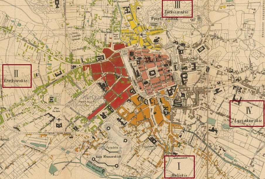 Мапа Львова XIX ст. поділяє місто на такі райони: