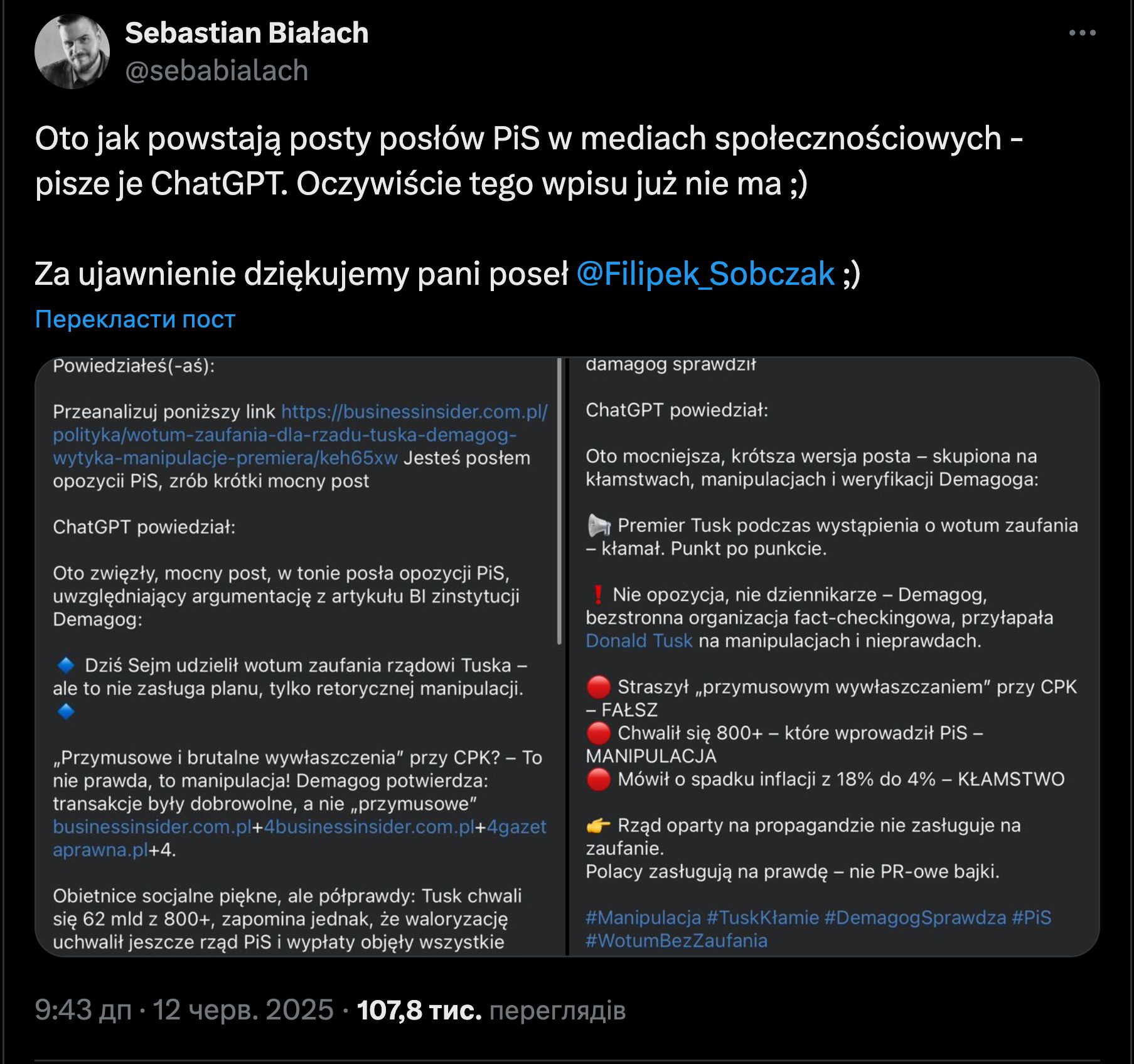 Журналіст сайту Onet Себастьян Бялах звернув увагу на дивний пост Магдалени Філіпек-Собчак у соцмережі X. У дописі депутатка попросила в ChatGPT підготувати «аналіз» виступу премʼєр-міністра Дональда Туска в Сеймі. Її запит звучав так: «Ти депутат від опозиційної партії ПіС. Проаналізуй лінк і зроби короткий, сильний пост».