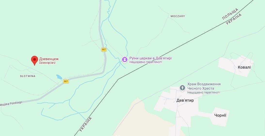 Два села Дев’ятир по обидві сторони кордону (Google Maps)
