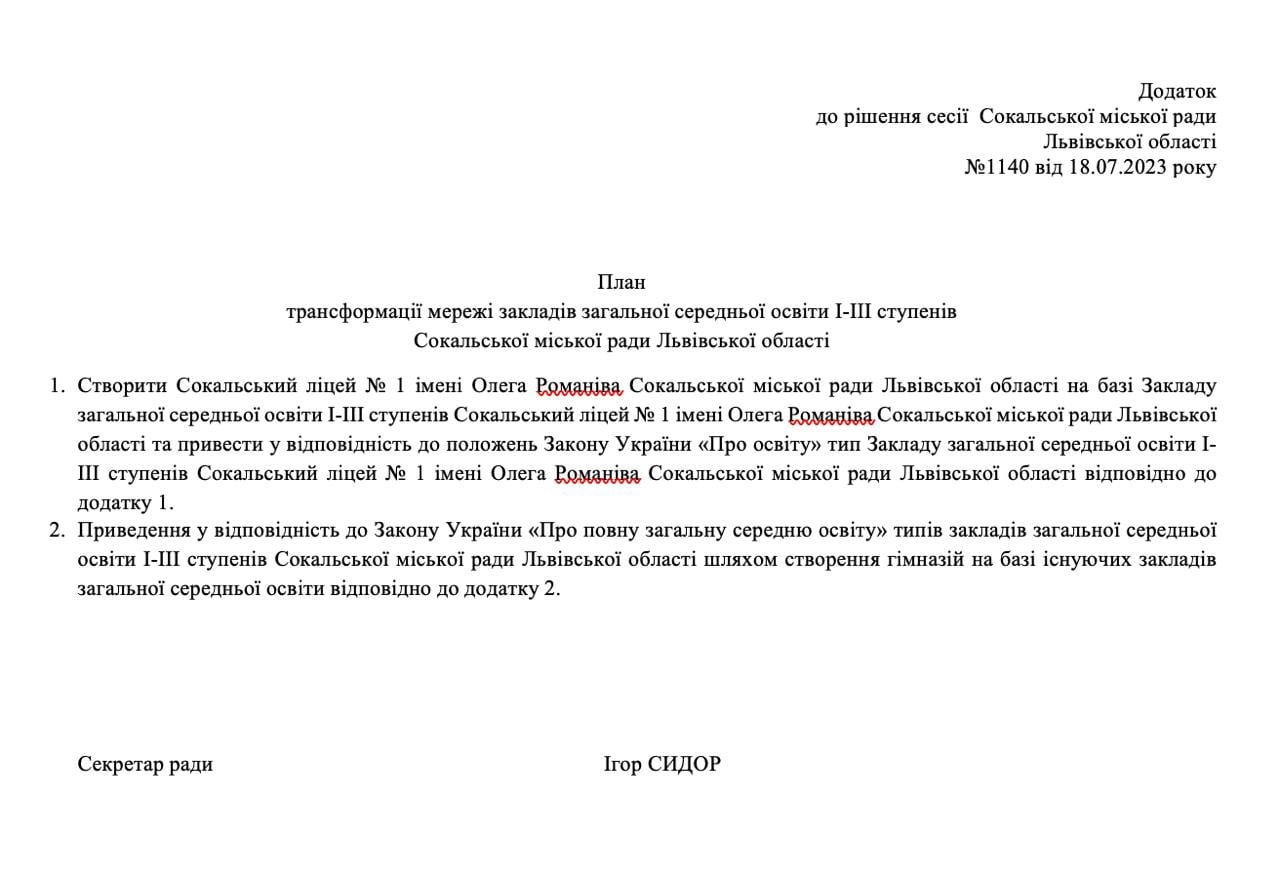 Мер Сокаля Сергій Касян своїм розпорядженням від 18 липня 2023 року вказав, що з 1 вересня 2027 року змінюватимуть типи навчальних закладів за реформою НУШ.
