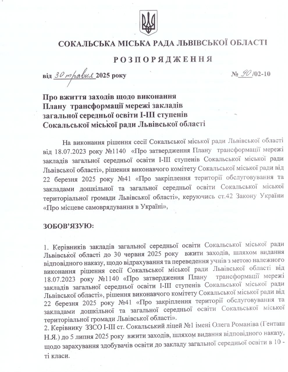 30 травня 2025 року мер видав ще одне розпорядження, в якому вказав, що з 3 червня 2025 року директори усіх шкіл громади повинні видати накази про відрахування та переведення учнів 10 класів. У документі пояснюється, що підставами для такого рішення є соціально-економічна ситуація та результати громадського обговорення. Проте у розмові зі ZAXID.NET Христина Чернявська, мама однієї із десятикласниць, розповіла, що міська рада не надала протоколи громадських обговорень на її запит, а інших обґрунтувань щодо пришвидшення реформи влада не зазначає.