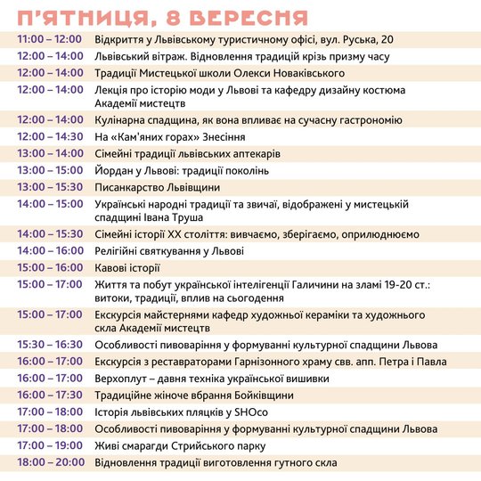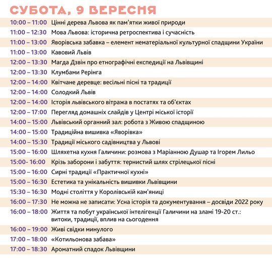 Заплановані події відбуватимуться у форматі екскурсій, майстер-класів, лекцій, пікнік-презентацій, вистав, концертів, співочих посиденьок, переглядів домашніх слайдів. Реєстрація на події вже стартувала і триватиме до 7 вересня 17:00. Повна програма – за посиланням.