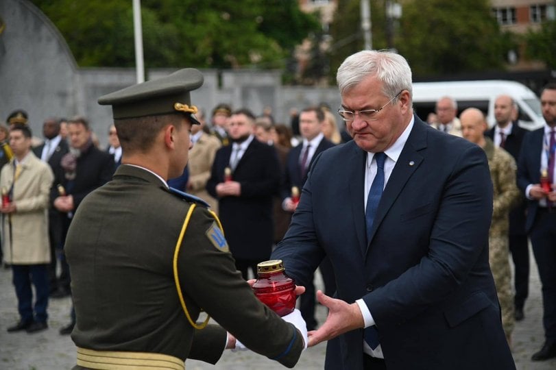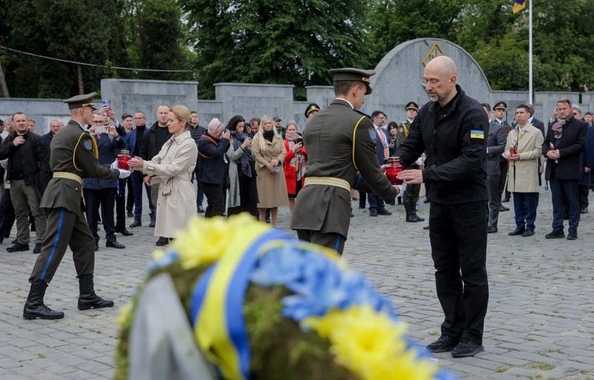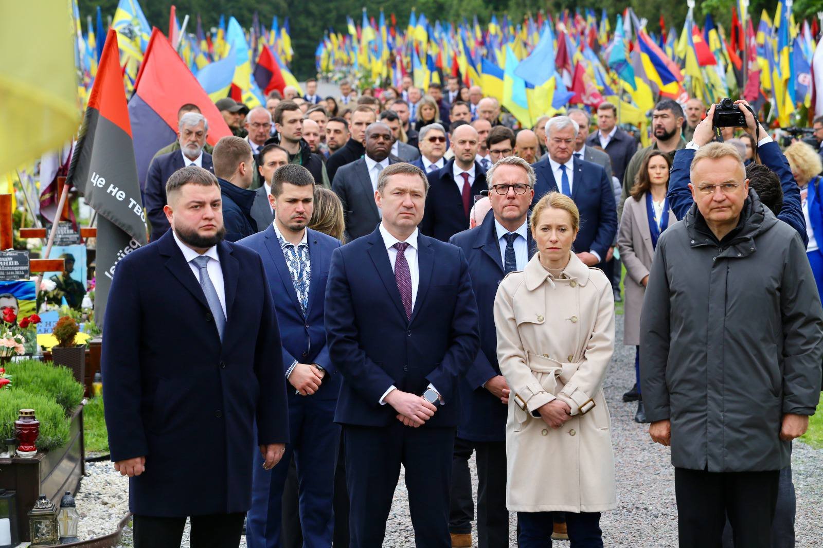 політики безпеки Кая Каллас та міністри закордонних справ країн ЄС. Також прибули премʼєр-міністр України Денис Шмигаль та міністр МЗС Андрій Сибіга. Вони вшанували у Львові пам’ять загиблих захисників. Про це у своїх соцмережах повідомив начальник Львівської ОВА Максим Козицький.