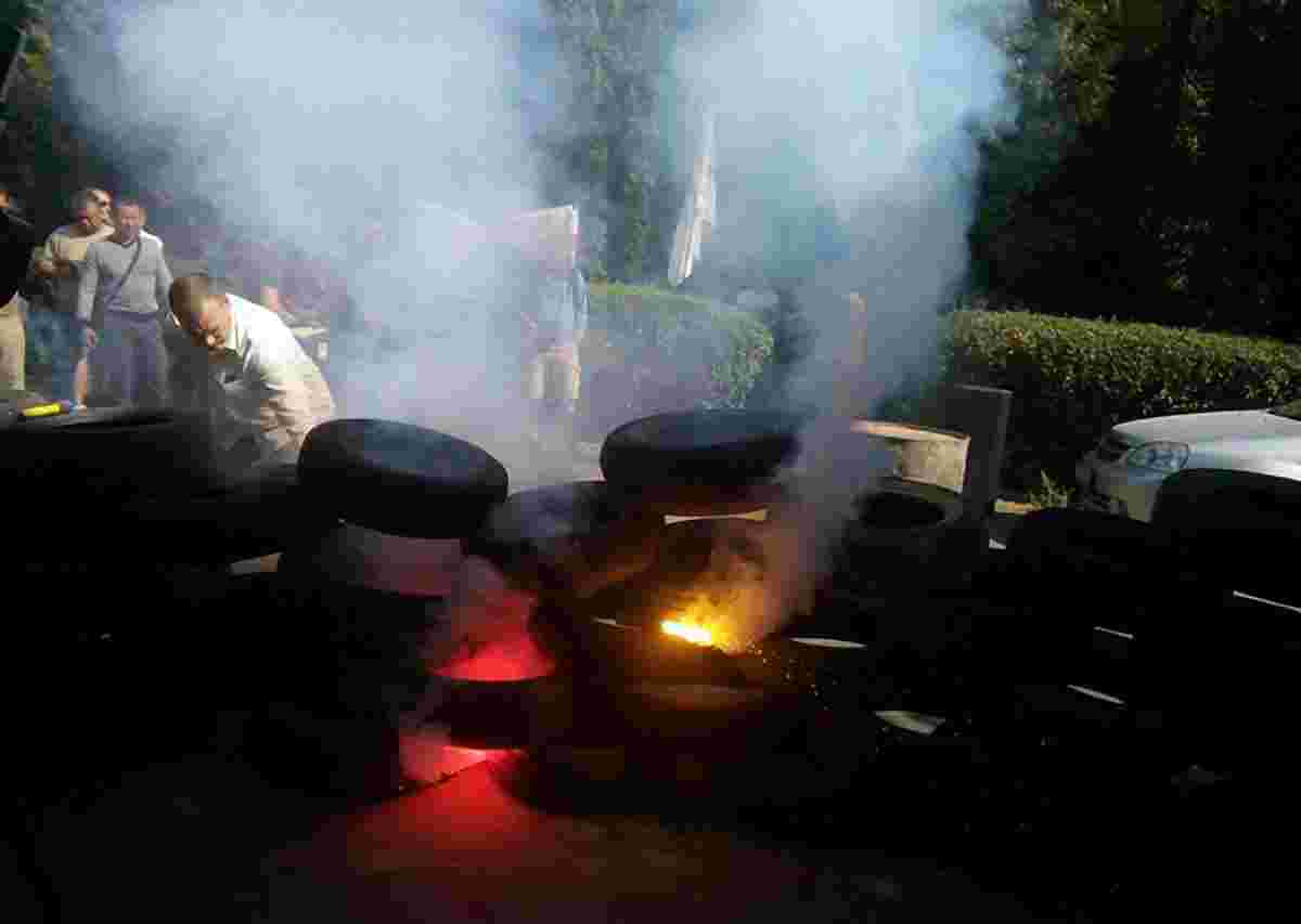 Лідер «Економічного бойкоту» Олег Радик запостив на своїй фейсбук-сторінці фотографії шин, які активісти принесли до головного входу у «ВіЕс банк».