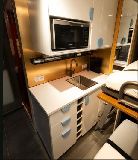 Щоб укриття не виглядало як «похмурий куб», на одній зі стін встановлений екран, що імітує вигляд з вікна.