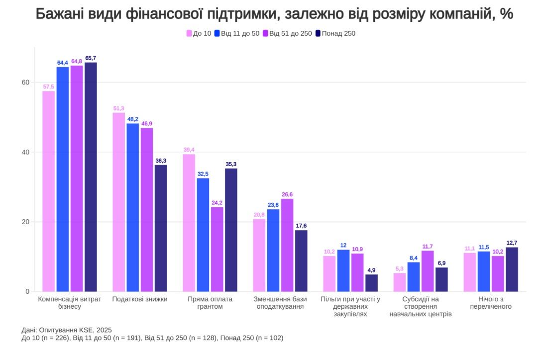 Великі підприємства частіше віддають перевагу прямим компенсаціям (66% проти 57% серед малих компаній). Малі та середні компанії більш зацікавлені у податкових знижках (47–51% проти 36% серед великих компаній). Пряма виплата у формі гранту найпопулярніша серед мікробізнесу (до 10 співробітників – 39%) та великих підприємств (35%). Зменшення бази оподаткування є бажанішим для середнього бізнесу (24–27%, 11–250 співробітників), ніж для мікро- або великого бізнесу.