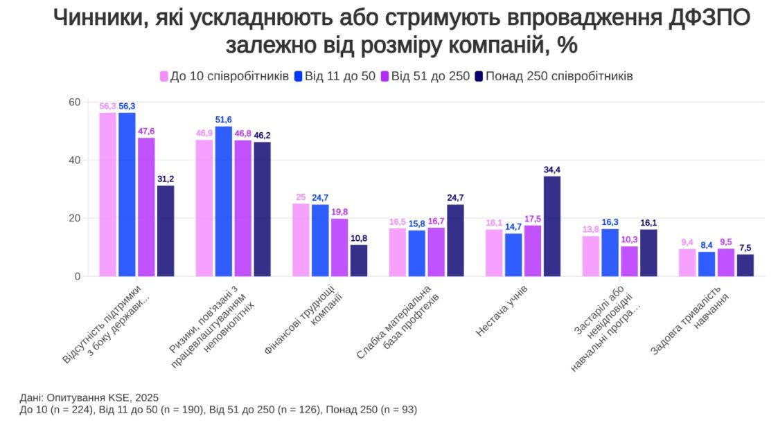 - нерозуміння формату дуальної освіти: бізнес вказує на брак методичних рекомендацій, інформаційної підтримки та рейтингів закладів, як бар’єри для участі в дуальній освіті.