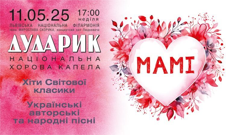 Концерт-подарунок для найрідніших! 11 травня у Львівській національній філармонії ім. Мирослава Скорика відбудеться особлива подія, присвячена Дню матері – святковий концерт «Дударик – МАМІ». Початок концерту о 17:00, зазначають у пресслужбі національної капели «Дударик».
