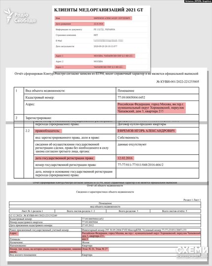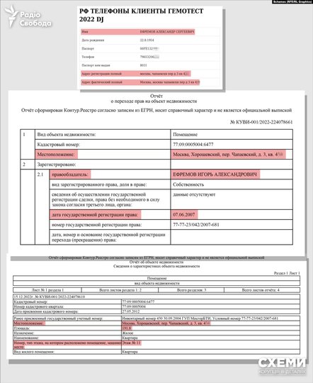 «У Росії Єфремов реєстрував своє місце проживання за адресою двох московських апартаментів. Зокрема, це – Москва, Чапаєвський провулок, 3. Це дані з витоків з бази приватної медичної лабораторії “Гемотест” за 2021 рік. За цією адресою розташований елітний житловий комплекс “Тріумф-Палас” – другий за висотою хмарочос в Росії після “Москва Сіті”, збудований у стилі сталінського ампіру», – йдеться у розслідуванні.