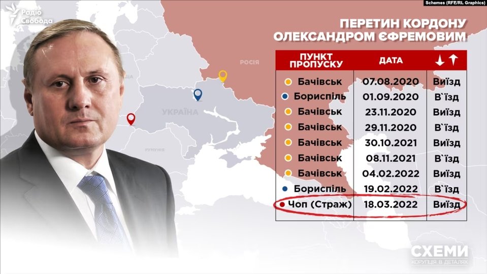 Після виходу з СІЗО екс-нардеп почав регулярно виїжджати з кордон, зокрема до Росії. Аж до лютого 2022 року Олександр Єфремов перетинав кордон із країною-агресором у пункті пропуску на Сумщині. 18 березня 2022 року «регіонал» пройшов контрольно-пропускний пункт «Чоп (Страж)», розташований на кордоні зі Словаччиною та більше не повертався до України. Перетин кордону колишній депутат здійснив залізницею.