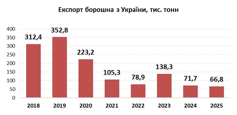 Експорт українського борошна у 2025 році знизився до 66,8 тис. тонн – найменшого показника з 2006 року, повідомляє видання АПК-Інформ з посиланням на звіт спілки «Борошномели України». Це на 36,6% менше, ніж до війни у 2021 році (105,3 тис. тонн), і на 15,3% поступається рівню 2022 року (78,9 тис. тонн).