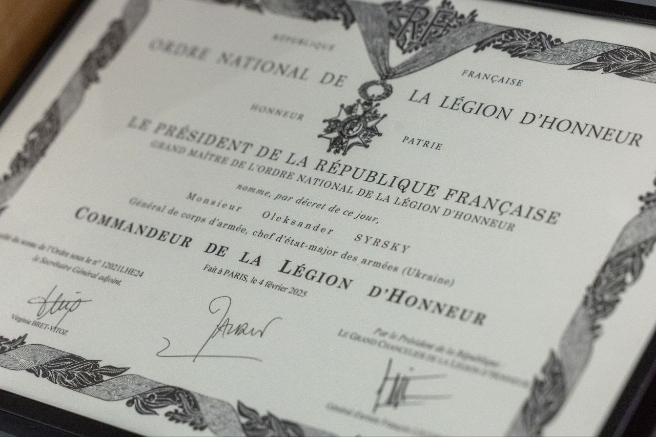 На завершення зустрічі Головнокомандувач французької армії Фаб’єн Мандон від імені президента Емманюеля Макрона вручив Олександру Сирському Орден Почесного легіону [Ordre national de la Légion d'honneur] – найвищу державну нагороду Франції, яка присуджується главою республіки за виняткові військові або цивільні заслуги.