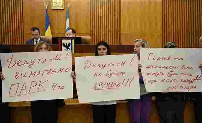 За інформацією сайту «Курс», за скасування конкурсу на будівництво реабілітаційного центру на міському озері проголосували 34 депутати. На сесію прийшли прихильники та опоненти будівництва центру. Люди стояли перед трибуною з плакатами «Депутати, не будьте хрунями!», «Гірші, ніж москальські воші, можуть бути тільки українські гниди», «Депутати, вимагаємо парк 4 га». Врешті сесія підтримала вимоги захисників зеленої зони.